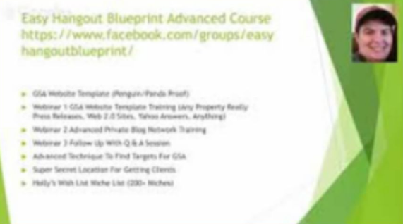 The Holly Starks Cooper – Easy Hangout Blueprint + OTO is a comprehensive training program designed to help users dominate any niche and rank on page one of Google for hundreds of keywords using just a single video. This course emphasizes the use of Google Hangouts to create and rank videos, leveraging SEO techniques and tools like GSA Search Engine Ranker, Rankwyz, FCS, Scrapebox, and Gscraper.